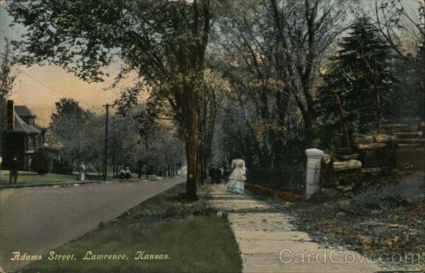Front: Adams Street, Lawrence, Kansas. Back: PUBLISHED BY LAWRENCE P. C. & NOVELTY CO., LAWRENCE, KANS KAD ASTRA PERASPERA FOR WRITING MESSAGES As top of the hill. ал as left. Chancellor residence MELA A-4739 THIS SPACE FOR ADDRESS ONLY
