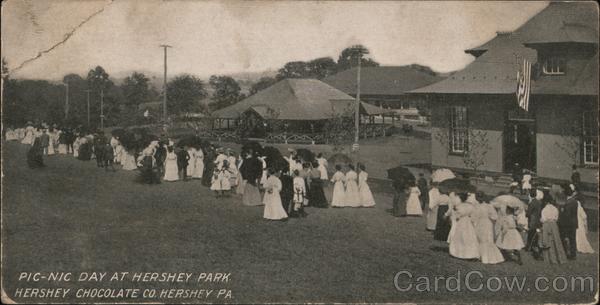 Front: PIC-NIC DAY AT HERSHEY PARK HERSHEY CHOCOLATE CO. HERSHEY PA. B Back: Write Message Below PLAGE 1 STAMP TWO CENTS