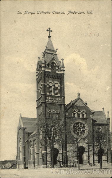 Front: St. Marys Catholic Church, Anderson, Ind. + Back: M. Weixelbaum, Publisher, Lima, O. 9-AM 19 11 IND. ONE CEN Made Kemay Bhaumburg haumsburg Ind 07 6866