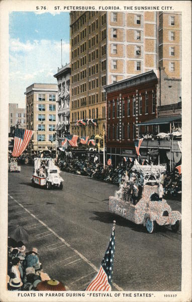 Front: S-76. ST. PETERSBURG, FLORIDA, THE SUNSHINE CITY. Lederal COFC 105337 FLOATS IN PARADE DURING "FESTIVAL OF THE STATES". Back: MADE IN USA T. AMERICAN ART FLORIDA TEC