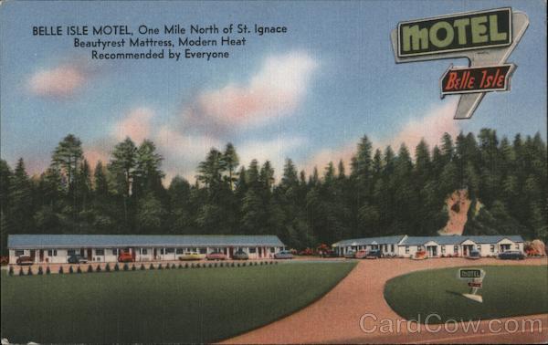 Front: BELLE ISLE MOTEL, One Mile North of St. Ignace Beautyrest Mattress, Modern Heat Recommended by Everyone MОTEL Belle Isle Back: #9 10 88191 L. L. COOK CO., POST CARDS, MILWAUKEE, WISCONSIN