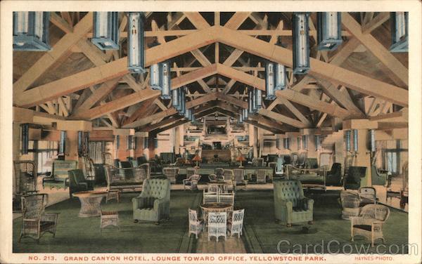 Front: WK Now! NO. 213. GRAND CANYON HOTEL, LOUNGE TOWARD OFFICE, YELLOWSTONE PARK. HAYNES-PHOTO. Back: PUBLISHED BY HAYNES, ST. PAUL. OFFICIAL PHOTOGRAPHER, YELLOWSTONE NATIONAL PARK. R-54163 MESSAGE. [Stamp Here] Domestic, 1c Foreign, 2c