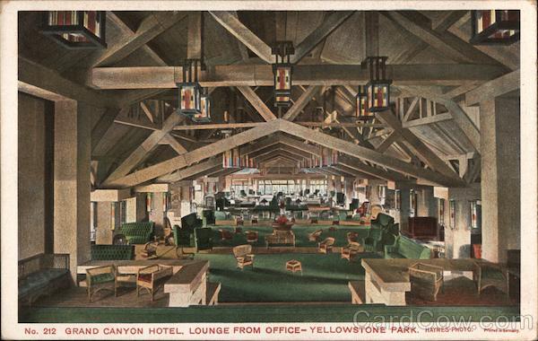Front: YAR No. 212 GRAND CANYON HOTEL, LOUNGE FROM OFFICE-YELLOWSTONE PARK. HAYNES-PHOTO. Printed in Germany. Back: MESSAGE. пиш [Stamp Here] Domestic, 1c Foreign, 2c