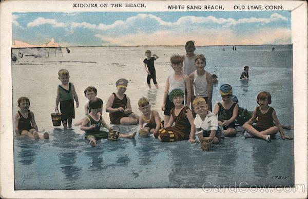 Front: HA KIDDIES ON THE BEACH. 14 AT WHITE SAND BEACH, OLD LYME, CONN. CAT 11 11 17315 Back: Series 905 Surf Bathers 12 Designs AUG 5 PML MADEMUSA IN Place the Stamphere and Island Possessions Cuba, Canada and for foreign