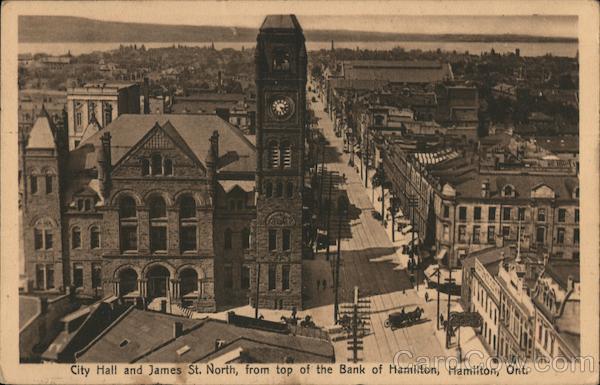 City Hall and James St. North, from top of the Bank of Hamilton, Hamilton, Ont.