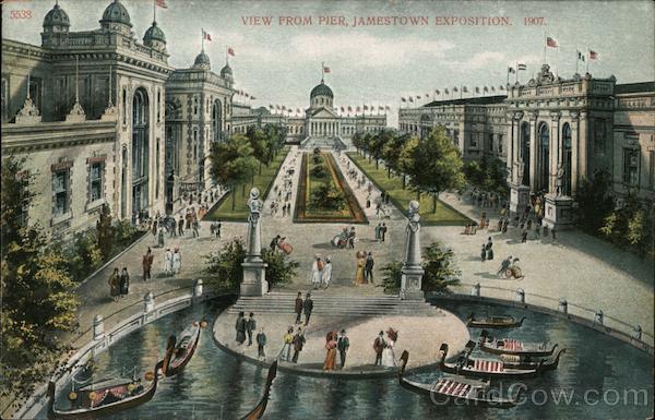 Front: 5538 4. VIEW FROM PIER, JAMESTOWN EXPOSITION. 1907. Fr LIVE FOLL reen Back: Made in Germany. A. C. Bosselman & Co., New York. Photo copyrighted. One Cent for United States, and Island Possessions, Cuba, Canada and For Foreign.