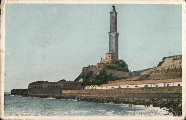 Front: 450 GENOVA - Lanterna. சிரிசி Back: CARTE POSTALE POSTKARTE Miſs Poobel. 3. Kerr, Мір 10 4 4. Broaderick St. San. Francisco USO ITALIANE 10 CENTESIM 10 usa