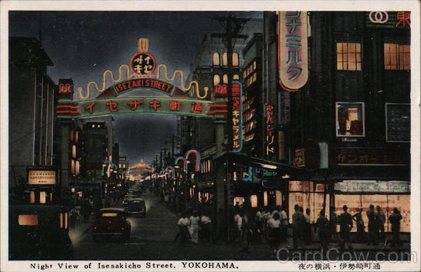 Front: キャ ISEZAKI STREET イセザキ B 通 TR 香示キャラメル Night View of Isesakicho Street, YOKOHAMA. シーリド VADO コナミルク 71- 夜の横浜・伊勢崎町通 Back: Fukuds 25 郵便はがき