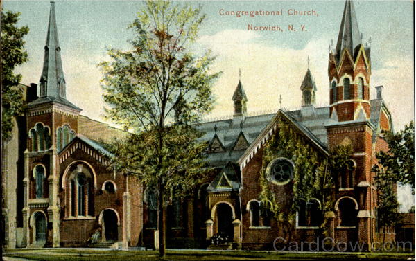Front: Congregational Church, Norwich, N. Y. Back: N. B./11448 Published by The American News Company New York, Leipzig, Berlin. CHENANGO PLEIPZIG BERUN DRESDEN LITHO CHROME Germany. 25 and Possession Canada and all other Countries 1836