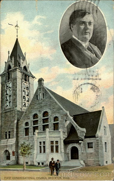 | THE FIRST CONGREGATIONAL CHURCH ON PLEASANT STREET NEAR MAIN STREET WAS BUILT IN 1896 AND 1897 AT A COST OF ABOUT $100,000 EXCLUSIVE OF LAND. IT WAS DEDICATED IN DECEMBER 1897 AND REPLACED WHAT FOR MANY YEARS WAS LAUD MARK AND KNOWN AS "THE BROWN CHURCH", WHICH WAS BURNED IN JANUARY 1894. THE CHURCH SOCIETY WAS ORGANIZED IN 1740. THE REV. ALLAN HUDSON WAS INSTALLED AS PASTOR IN DECEMBER 1897. |