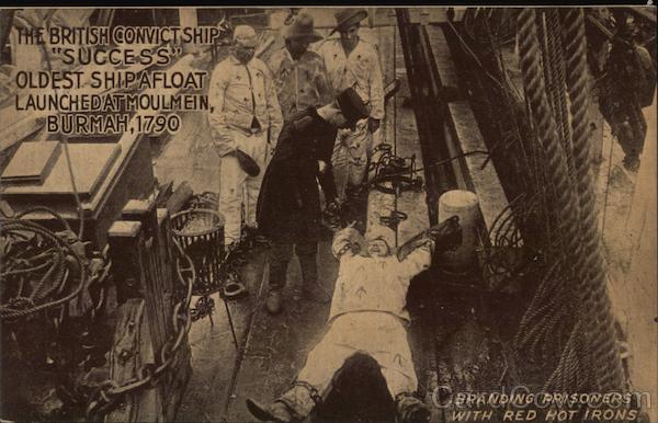 THE BRITISH CONVICT SHIP "SUCCESS OLDEST SHIP AFLOAT LAUNCHEDAT MOULMEIN, BURMAH, 1790 BRANDING PRISONERS WITH RED HOT IRONS.