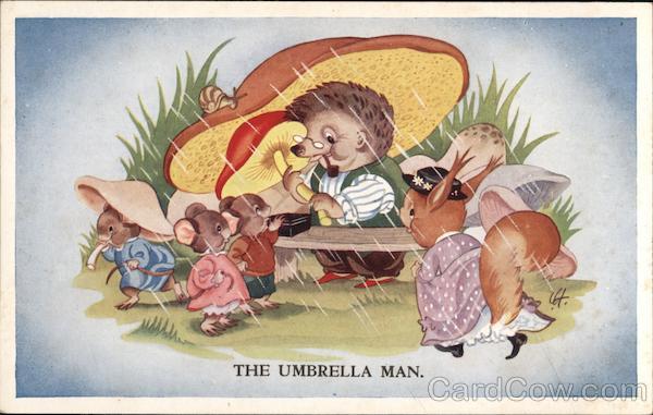 Front: Micr 10 ** THE UMBRELLA MAN. 4. Back: VALERIE HODGE "PLAYMATES" SERIES COPYRIGHT. PUBLISHED BY VALENTINE & SONS LTD., DUNDEE AND LONDON. Valentine's 1999 |||' GT. BRITAIN