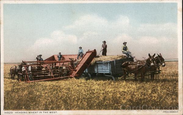 Front: 14829 HEADING WHEAT IN THE WEST. FRED HARVEY. Back: MADE ONLY BY DETROIT PUBLISHING CO. co. "PHOSTINT" CARD. TRADE MARK REG. U. S. PAT. OFF. FRED THIS SPACE MAY BE USED FOR MESSAGE. AND CANADA. FOREIGN. TWO CENTS