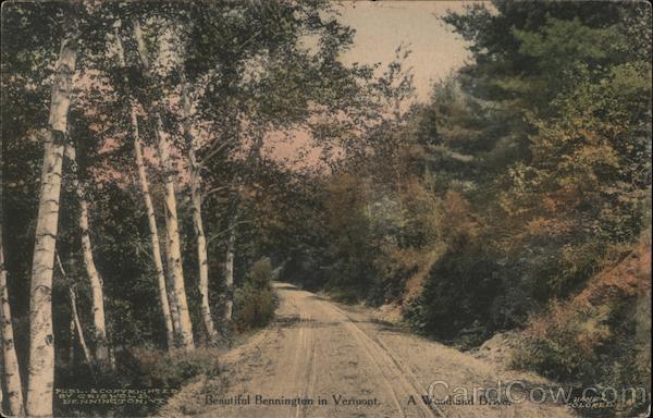 Front: PUBL. & COPYRGHTER BY GR ISWOL D BENNINGTON, T Beautiful Bennington in Vermont. A Woodland Drive. HAND COLORED. Back: DOMESTIC, 1c. FOREIGN, 2c. THE ALBERTYPE CO. BROOKLYN, N, Y,