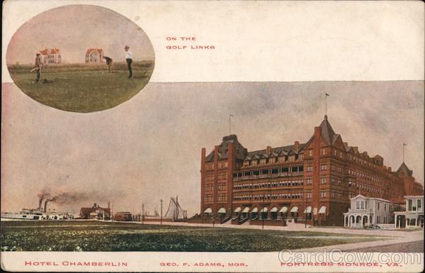 Front: ON THE GOLF LINKS HOTEL CHAMBERLIN GEO. F . ADAM S, MGR. FORTRESS M ONROE, VA. Back: 4.00 DOMESTIC & CANADA 2 s THIS SPACE MAY BE USED