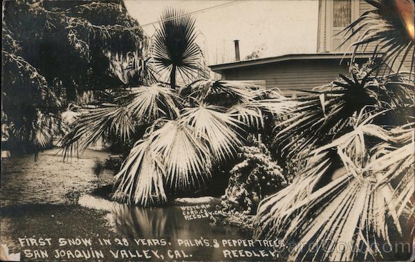 FIRST SNOW IN 28 YEARS. PALM'S.S PEPPER TREES.