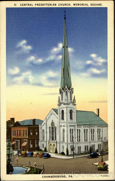Front: 11 CENTRAL PRESBYTERIAN CHURCH. MEMORIAL SQUARE. E-4968 CHAMBERSBURG, PA. Back: 50 S. & H. STATIONERY, CHAMBERSBURG, PA