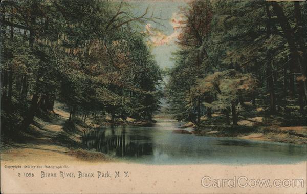 Front: Copyright 1905 by the Rotograph Co. G 106b Bronx River, Bronx Park, N. Y." Back: The Rotograph Co., N. Y., City. (Germany.) 6,50 Two cents
