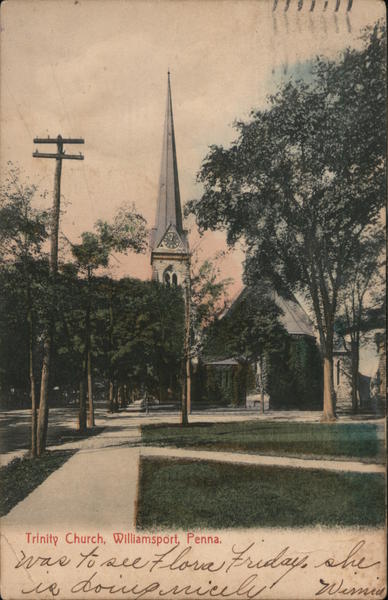 Front: Trinity Church, Williamsport, Penna. was to see Friday, she Flora is doing nicely Wernia Back: Publ. by Bert Wood, Williamsport, Pa. Made in Germany. JUL 21 530 PM 1908 771M PA 1 c Milo & Kulp. Haue, Pa 2 c.