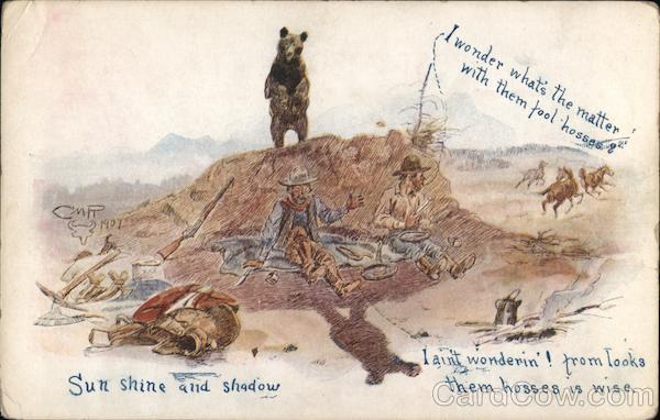 Front: CMP 1907 Wh Sun shine and shadow I wonder what's the matter with them fool hosses? 14970 不用 laint wonderin' from looks them hosses is wise. Back: Published by W. T. Ridgley Calendar Co., Great Falls Mont. HERE
