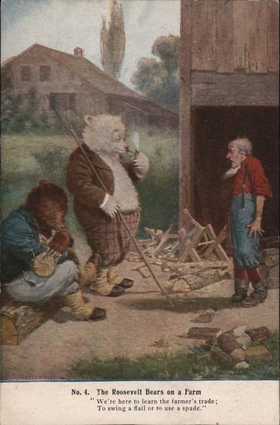 Front: No. 4. The Roosevelt Bears on a Farm We're here to learn the farmer's trade; To swing a flail or to use a spade." 11 Back: Place the Stamp One Cent for United States and Island Possessions, Cuba, Canada and Two Cents for Foreign