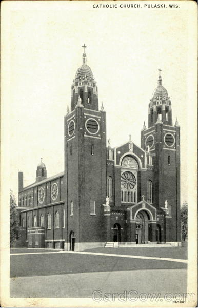 Front: CATHOLIC CHURCH, PULASKI, WIS. OA5081 Back: 60 MADE BY CURT TEICH & CO., INC., CHICAGO, U.S. A TO CHIC