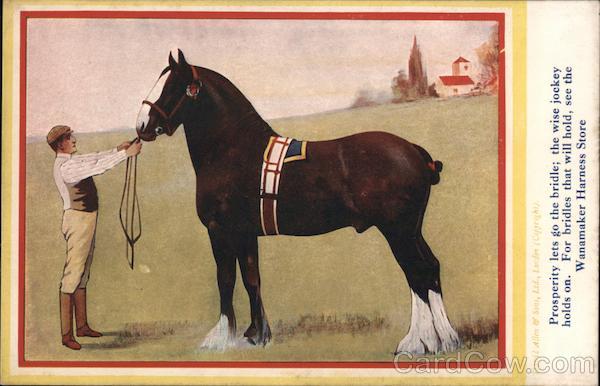 Front: Davil Allen & Sons, Ltd., London (Copyright). Prosperity lets go the bridle; the wise jockey holds on. For bridles that will hold, see the Wanamaker Harness Store Back: TWO CENTS