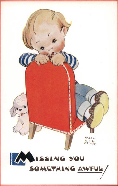 Front: MIS MABEL LUCIE. ATTWELL ISSING YOU SOMETHING AWFUL/ Back: MABEL LUCIE ATTWELL COPYRIGHT. VALENTINE & SONS, LTD., DUNDEE AND LONDON, ALL GENUINE ATTWELL POSTCARDS HAVE THE ARTIST'S SIGNATURE THUS: - 5509 GT. BRITAIN Valentine's CARD
