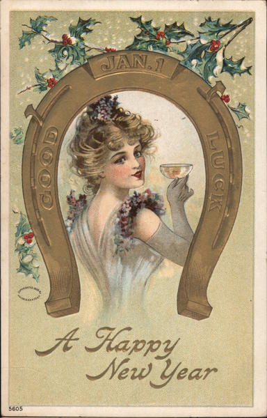 Front: COPYRIGHTED IS JULIUS B 5605 & CON JAN.1 LUCK A Happy New Year Back: NEW YEAR SERIES NUMBER 560 THIS SPACE MAY BE USED FOR WRITING DOMESTIC: FOREIGN: From Sister Maria Cowan Ja Sista Anna Cawrence а