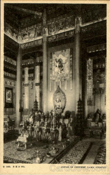 Front: 1933. RHD CO. ALTAR IN CHINESE LAMA TEMPLE Back: A CENTURY OF PROGRESS 202. Altar in Chinese Lama Temple R. R. DONNELLEY DEEPTONE & SONS CO., CHICAGO COPYRIGHT, 1933, AND PUBLISHED BY THE REUBEN H. DONNELLEY CORPORATION, CHICAGO