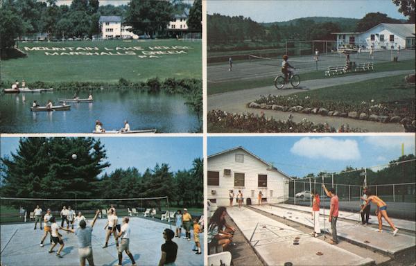 | "Poconos' Most Active Resort" A view showing some of the many activities available at this modern summer resort, 2 all-weather tennis courts, Volleyball, Florida shuffleboard, and boating on the lake. Telephone: Area Code 717-421-5410 |
