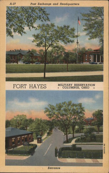 Front: A-37 Post Exchange and Headquarters FORT HAYES MILITARY RESERVATION COLUMBUS, OHIO Entrance 9A-H2096 Back: W. E. AYRES, 1049 LIVINGSTON AVE., COLUMBUS, OHIO