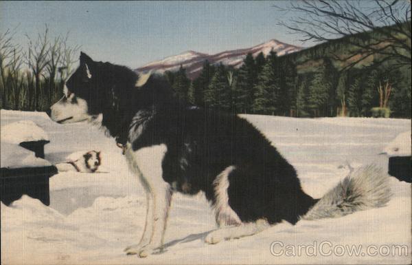 Eda, one of the family of Eskimo Sled Dogs, raised and maintained at Clark's Ranch at North Woodstock, N. H. PHOTOGRAPHY BY W. MURRAY CLARK THIS IS YOUR SOUVENIR TICKET KEEP IT OR MAIL IT FROM HERE 2C-H741 THE COURIER PRINTING CO., LITTLETON, N. H.