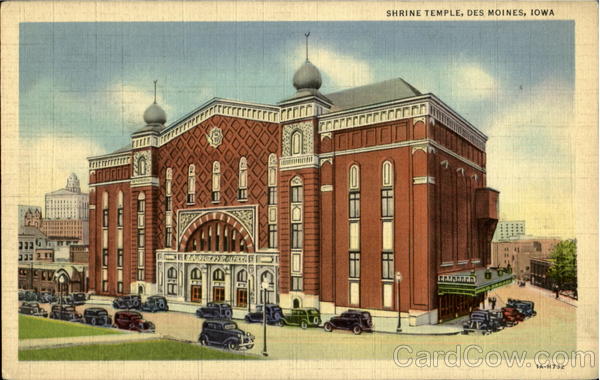 Front: SHRINE TEMPLE, DES MOINES, IOWA 4A-H732 Back: "C.T. ART-COLORTONEā REG.U.S. PAT. OFF. MADE ONLY BY CURT TEICH & co., INC., CHICAGO HYMAN'S NEWS & BOOK STORE, DES MOINES, IOWA