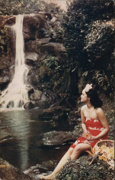 C8-ISLAND GIRL Native Island Girl, in colorful cos- tume by waterfall in Hawaii. Kodáchrome by Mike Roberts “Wesco” Spectratone COLOR CARD REPRODUCED FROM NATURAL COLOR PHOTOGRAPH * * *