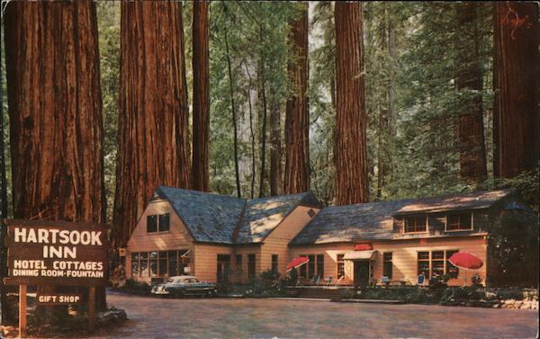 Front: HARTSOOK HOTEL COTTAGES I DINING ROOM-FOUNTAIN GIFT SHOP Back: HARTSOOK INN in the heart of the Redwoods on the world-famous Redwood Highway U.S. No. 101. Piercy, California. Roberts COLOR Mike Kaherta BERKELEY 2, CALIF. SC4509