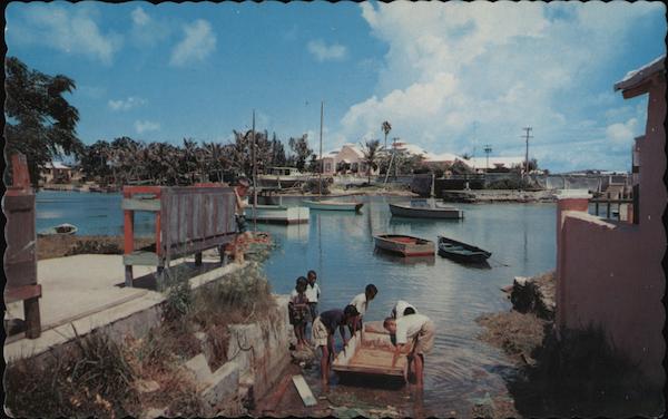 The Launching ยท These young fellows of Flatts Village are preparing to set sail in full view of the Bermuda Government Aquarium. I Bermuda Pub. by Bermuda Drug Co., Ltd., Hamilton, Bermuda ADI. 87852 SPACE,