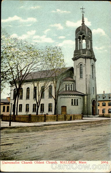Front: ALI Universalist Church Oldest Church, MALDEN, Mass. 3004. *+ Back: Made in Germany. A. C. Bosselman & Co., New York. 75 One Cent for United States, and Island Possessions, Cuba, Canada and For Foreign.