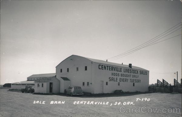 Front: SALE BARN CENTERVILLE LIVESTOCK SALES HOGS BOUGHT DAILY SALE EVERY TUESDAY CENTERVILLE, SO. DAK. T-190 Back: lave FOST CARD EK L COUR CO алд 1955 1 HERE 0