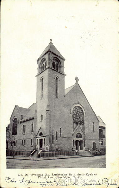 Front: J.KOEHLER.N No. 76. Svenska Ev. Lutherska Bethlehem-Kyrkan Third Ave., Brooklyn, N. Y. Promin ned. yeur. Back: % 6.4 W.. 75 FRANKLIN 1790 mpin Restaurant. Qurita Robertson. Oneida Spew York.