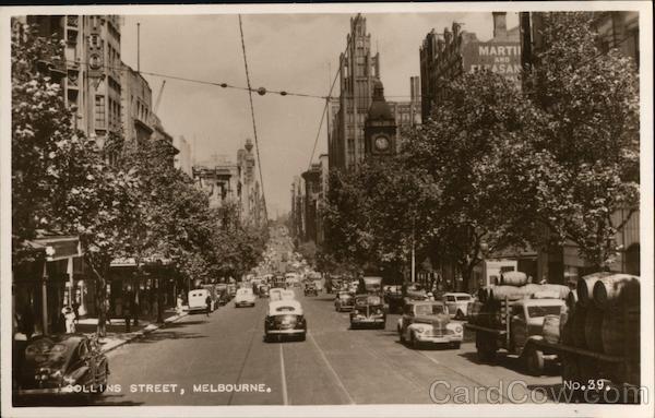 Front: COLLINS STREET, MELBOURNE. MARTII FIFASAN SOPALE No.39. Back: Adelaide. Published by the Valentine Publishing Co., Melbourne Sydney SENDING YOU GREETINGS Valentine's THIS IS A REAL PHOTOGRAPH GT. BRITAIN FOR ADDRESS ONLY