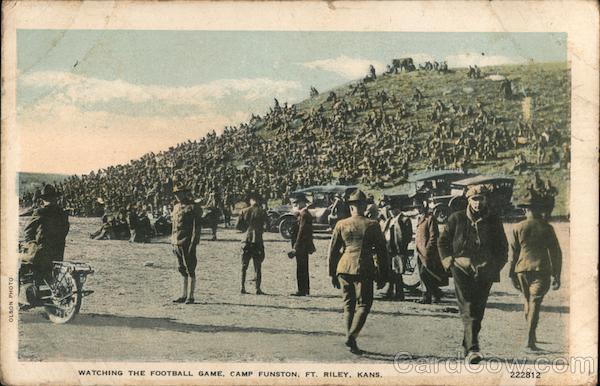 Front: OLSON PHOTO WATCHING THE FOOTBALL GAME, CAMP FUNSTON, FT. RILEY, KANS. 222812 Back: Sackett & Wilhelms Corp., New York and Brooklyn. Printed in U. S. A. SUPERIOR QUALITY FAMOUS THROUGHOUT THE WORLD Address Only