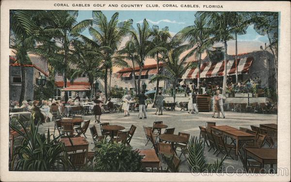 The Spanish Dance Patio of the Coral Gables Golf and Country Club, popular haunt of the pleasure-lover at Miami. The patio is set in a cluster of coconut palms and landscaped in tropical plants and flowers.