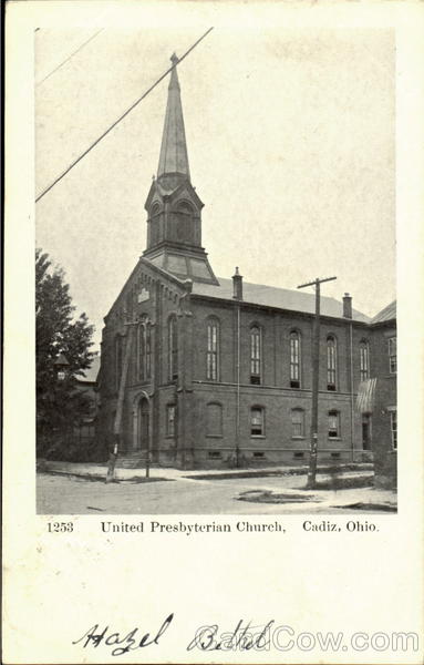 Front: 1253 United Presbyterian Church, Cadiz, Ohio. Hazel Bettel Back: 25 CADIZ MAR 30 930AM OHIO Mre Elenora J Matson R&D Cady NO 1 179.KLINTE STAGE TESO Chis