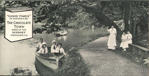 Front: "GOOD TIMES" IN HERSHEY, PA. THE CHOCOLATE TOWN HOME OF THE HERSHEY CHOCOLATE CO. HAFLOWER Back: WRITE MESSAGE BELOW