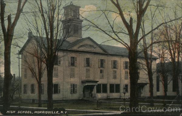 Front: HIGH SCHOOOL, MORRISYILLE, N.Y. Back: Morrisville auf 14 AND CANADA. Dean Hazel This is the High school building in Batarek caught 30 Yearoa Published by Wm. Jubb, Syracuse, N. Y. where