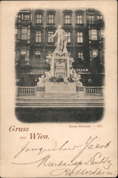 Front: But 19 ALTEN KOMODIEN BI Gruss peg aus TE MOZART MDCCLVI-MDCCXCI WAREN Mozart-Denkmal. — 1027. Wien. Jongenscher Jaarſ Merkeimp d'antig. Rotherdain. شد Back: An Correspondenz-Karte. Nur für die Adresse. in