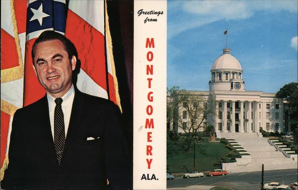 Front: Greetings MONTGOMERY ALA. www Back: GOVERNOR GEORGE C. WALLACE ALABAMA STATE CAPITOL Montgomery, Ala. Alabama Post Card Co., Bessemer, Ala. 35020 77417 ms HERE