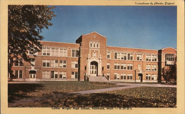 Front: Luther Wright High School, Ironwood, Mich.-K-39-D-2 Kodachrome by Charles Edquist JAW Back: 33557 Published by Paper Products Co., Duluth, Minn. Colorcraft-Made by the Dexter Press, Pearl River, N. Y. PLACE