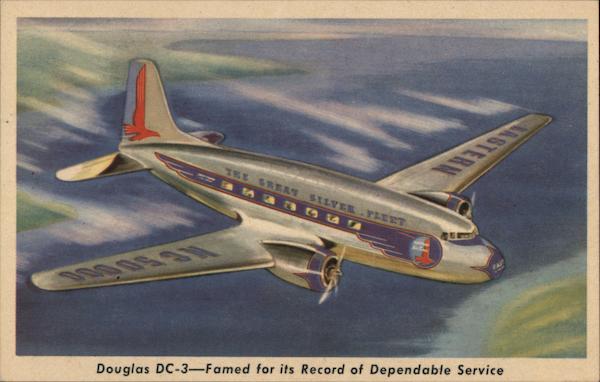 Famed for its record of dependable service. Familiar to air travellers everywhere are fast, powerful Douglas DC-3's. 21-passenger DC-3's are selected by Eastern to serve on flights of short distances. Flying at 175 miles per hour, Eastern's fleet of DC-3's provides commuter service which cannot be rivaled for convenience and comfort. |